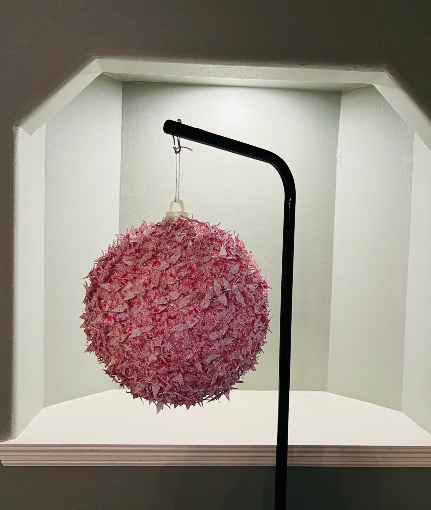 “A Mother’s Prayers” — the first canvas of 1000 origami cranes, started 1/19 and completed 12/19. The cranes are folded from the paper backing of feminine sanitary pads.
