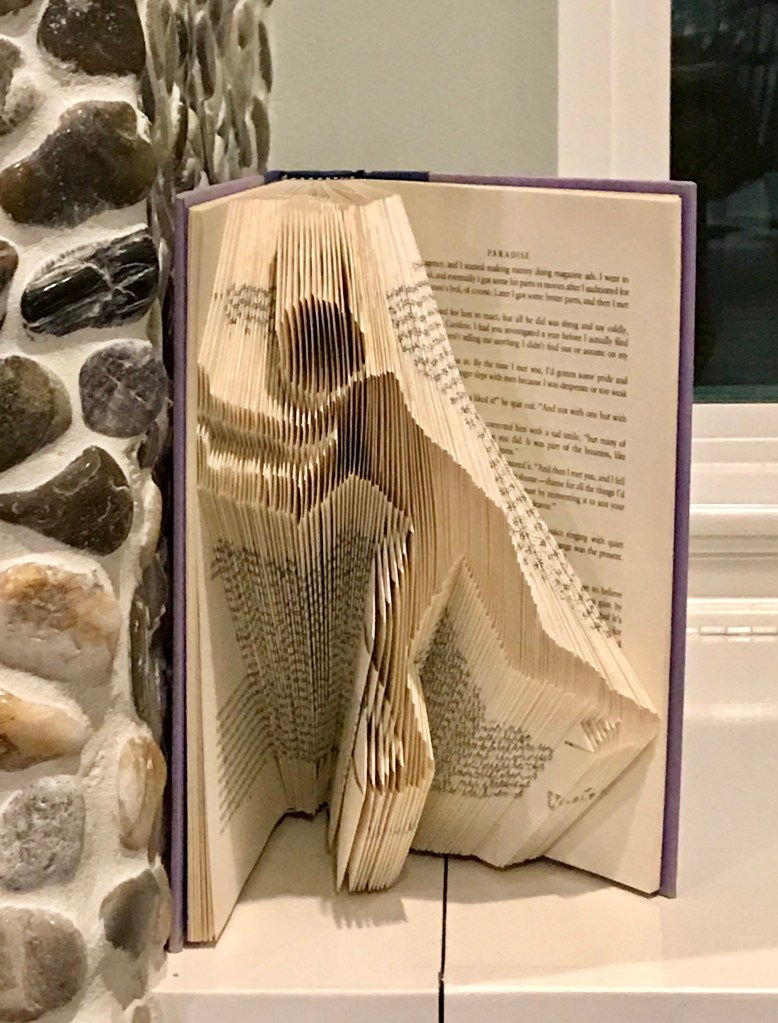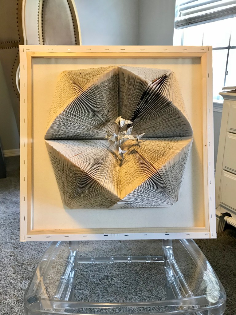 So I’ve been wondering if I am an artist? What is that boundary between craft and art? It’s not necessarily level of skill or amount of time spent on a piece. The cut and fold book art of a menorah, pictured above, is something I’d call craft. It took patience. It took time. It took practice. But it’s from a pattern that someone else created. And in the end, my product looks just like the picture that came with the pattern when I downloaded it. Except that I painted the cover gold.
